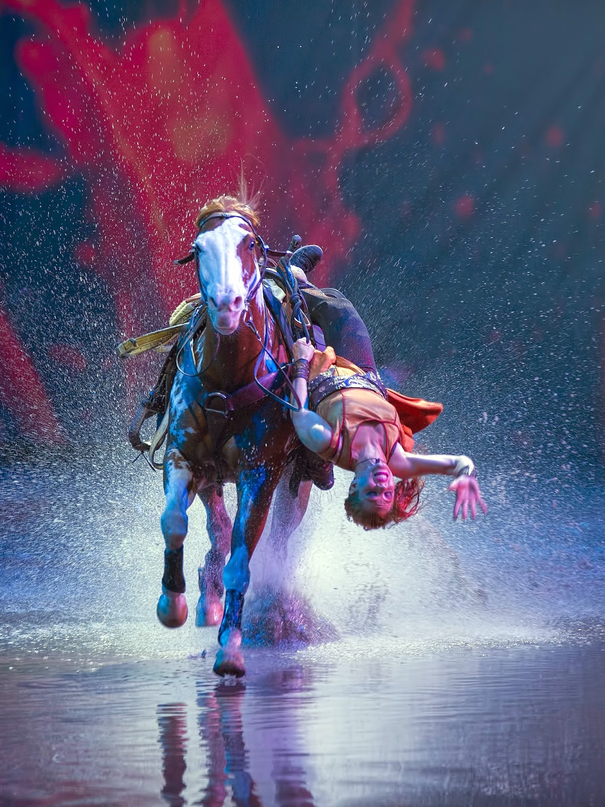 In Cavalia, horses cavort with the many artists in front of a constantly changing digital background projected onto a 60 metre-wide screen, drawing spectators into dream-like environments. Unlike traditional horse shows, Cavalia’s audience faces a single 50 metre-wide stage which allows the horses space to gallop at full speed, at times running completely free, unfettered by bridles or halters. The show takes place under a white, 2,440-square-metre big top, rising some 35 metres high that gives the horses an ample playground to perform with their trainers and artists. Cavalia’s White Theatre Tent is the largest touring tent in the world.