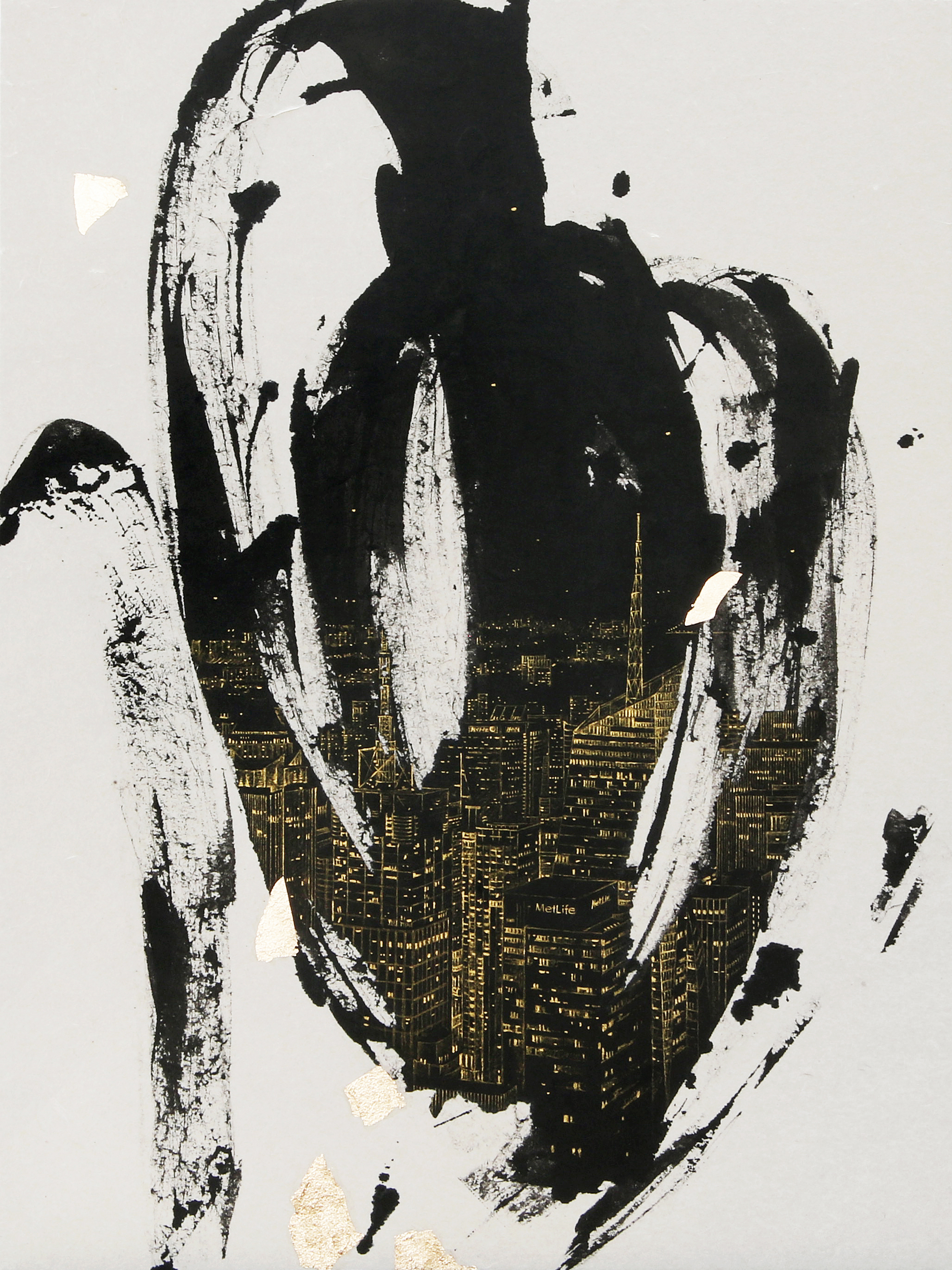 a new challenge – sculpture. The exhibition will feature four wall-mounted sculptures constructed of birch plywood, Park’s signature black paint and gold leaf. Leaving the cityscapes behind, the new works concentrate entirely on the expression of the brush stroke in three dimensions. Of her decision to create sculpture, Park says: