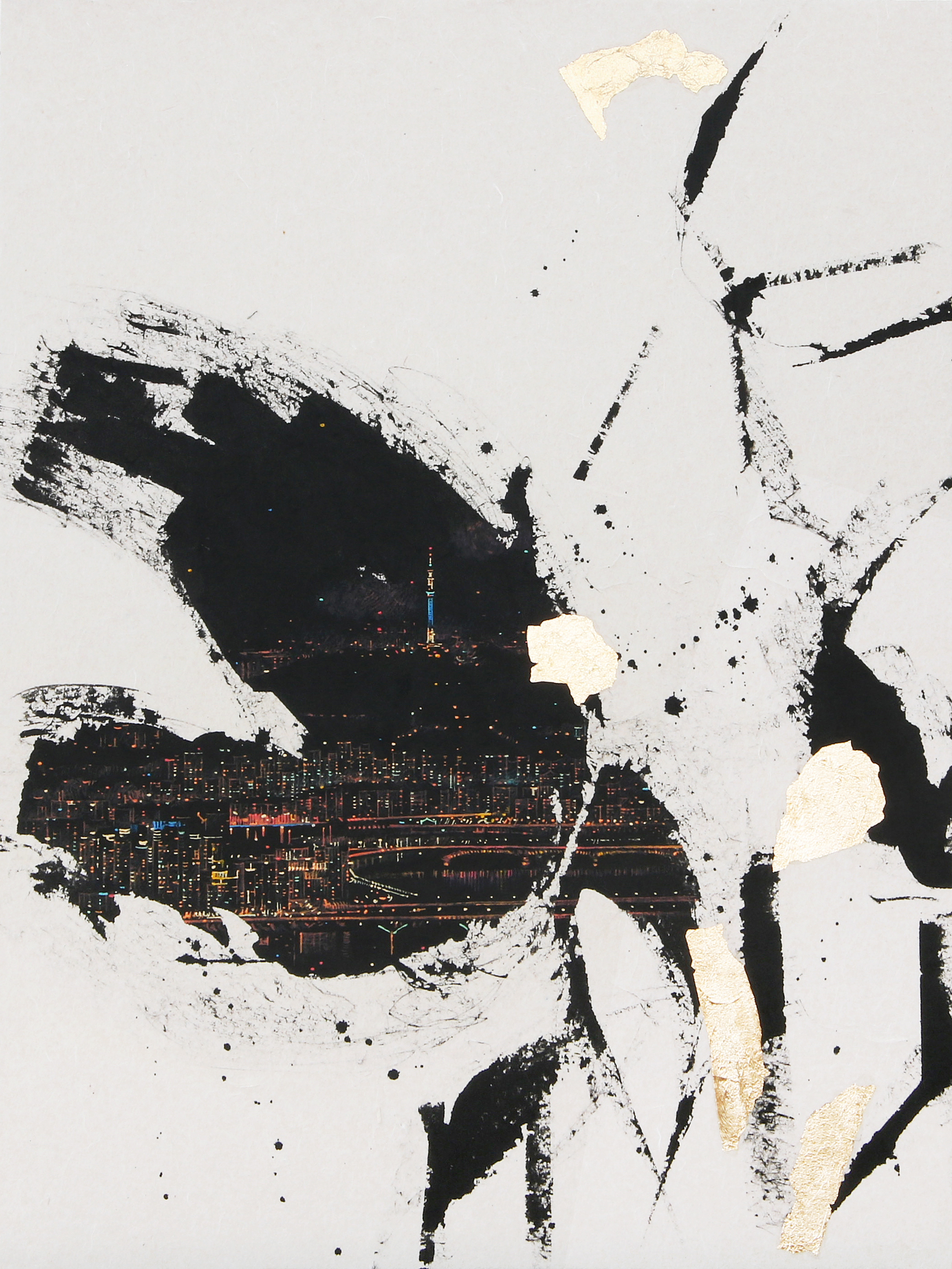 Park’s distinctive style blends large brushstrokes and splatters of ink with detailed depictions of urban landscapes at night. While capturing the excitement and magic of various cities – among these, for example, are Hong Kong, Singapore, London and New York – the works also reveal a more subdued, contemplative narrative. Through her paintings, Park hints at a paradox of urban life – being surrounded by thousands of people, yet feeling utterly alone. The artist states: