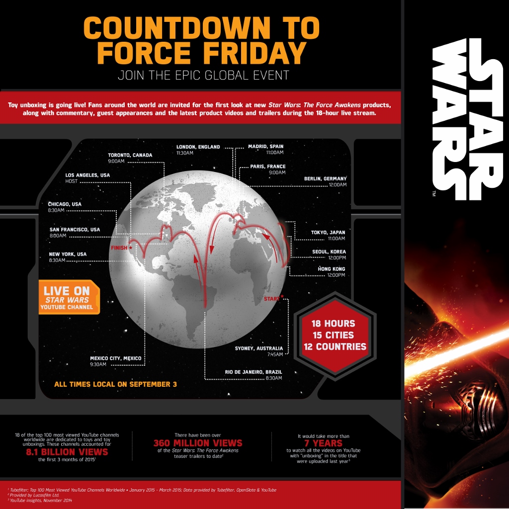 “Over the course of 18 hours, some of Maker Studios’ biggest stars will each be unboxing a new toy from the Star Wars: The Force Awakens product line in a different city around the world and sharing the experience live on YouTube.” said Leslie Ferraro, President, Disney Consumer Products. “We’ve seen tremendous excitement for these new products and can’t wait to see the global reaction from the Star Wars fan community.”